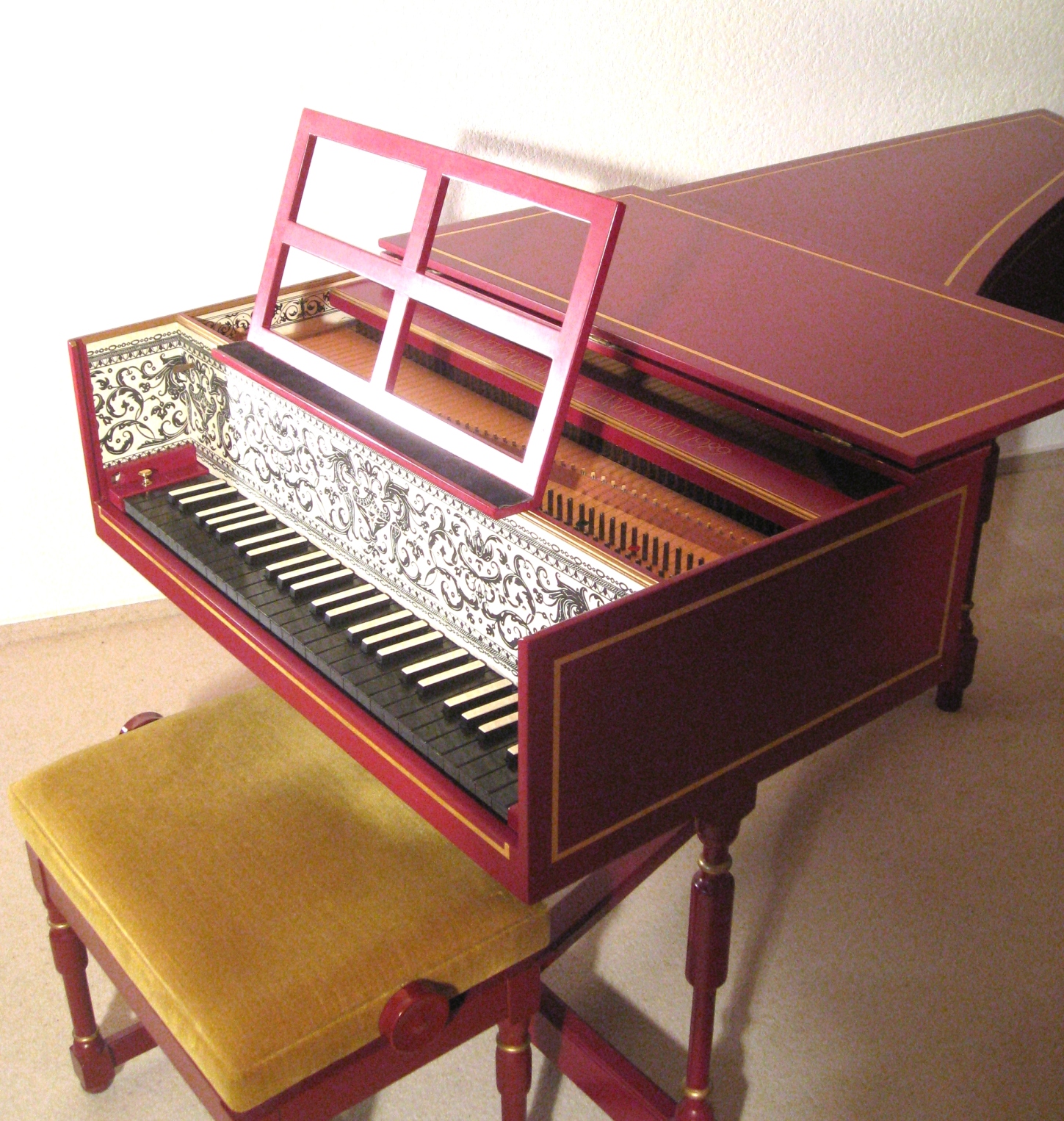 with bone key-tops, varnished with golden leafs, pedestal and harpsichord stool